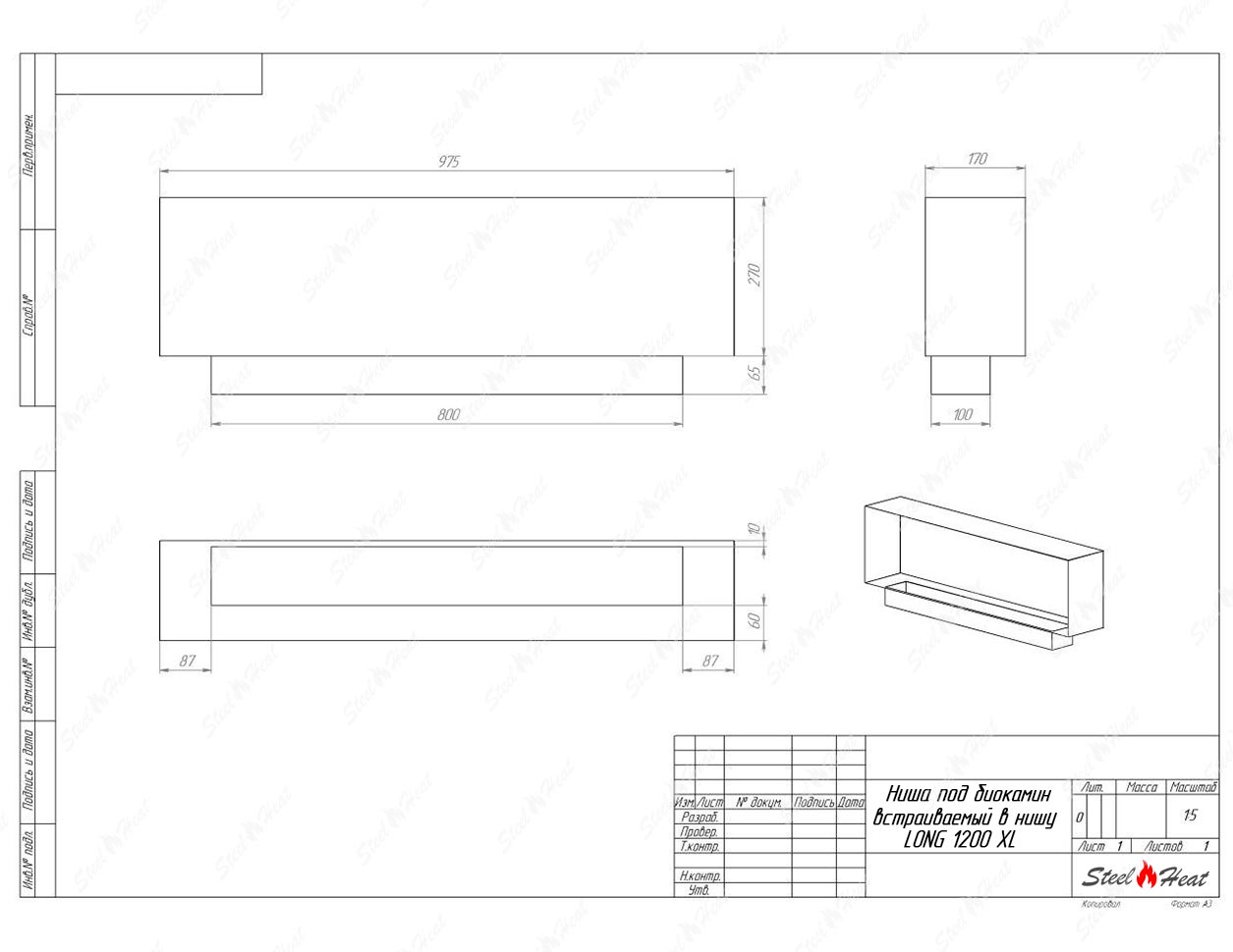 Встраиваемый Биокамин SteelHeat LONG-V 1200 XL предназначен для встраивания в глухие ниши из гипсокартона, кирпича, пеноблоков, бетона.
