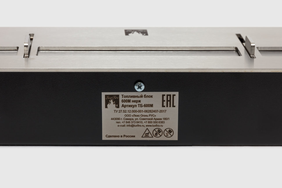 Особенность: Блок оснащен встроенным пламегасителем, позволяющим регулировать высоту пламени и удобную раскладку керамических дров. Имеет двойной корпус.